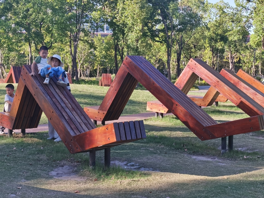 作为上海第1000座公园,徐汇西岸自然艺术公园见证上海迈入“千园之城”新阶段。图为家长带着孩子体验“千足虫”滑梯。 陈玺撼摄